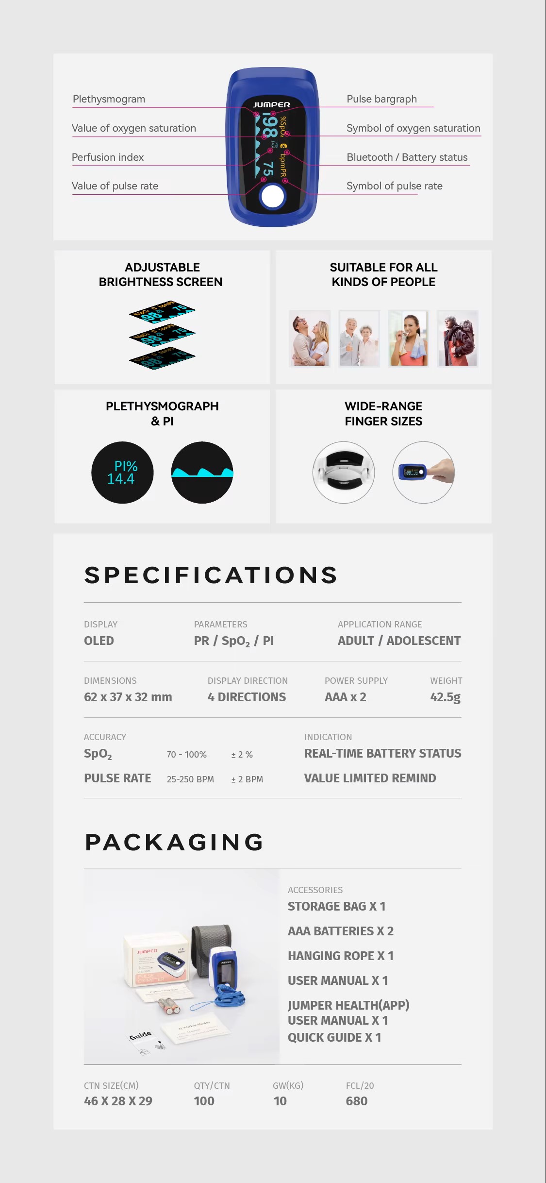 Pulse Oximeter Fingertip Jumper CE Approved Wireless Fingertip Pulse Oximeter with OLED Display